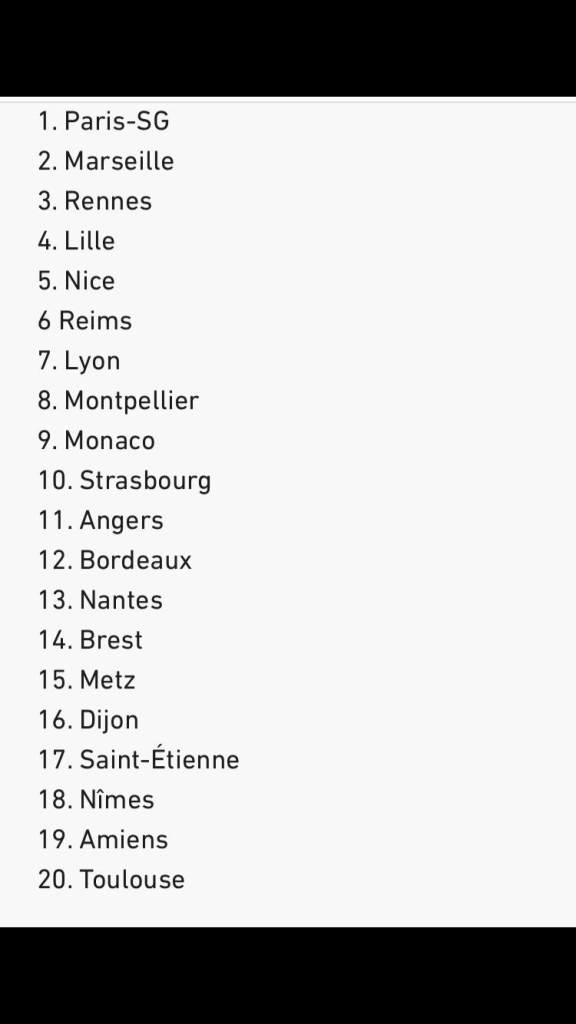 En France, suite à de nombreuses discussions en le gouvernement et le président de la fédération française de football, il en est ressorti que la Ligue 1 ne devrait plus se jouer. Officiellement, le classement n’a pas été modifié et le Psg(Paris saint germain) est donc champion de France pour la neuvième fois suivi de Marseilles et Rennes qui sont eux qualifiés pour la champion Ligue; par contre, Toulouse et Amiens sont relégués en deuxième division (Ligue 2) .
